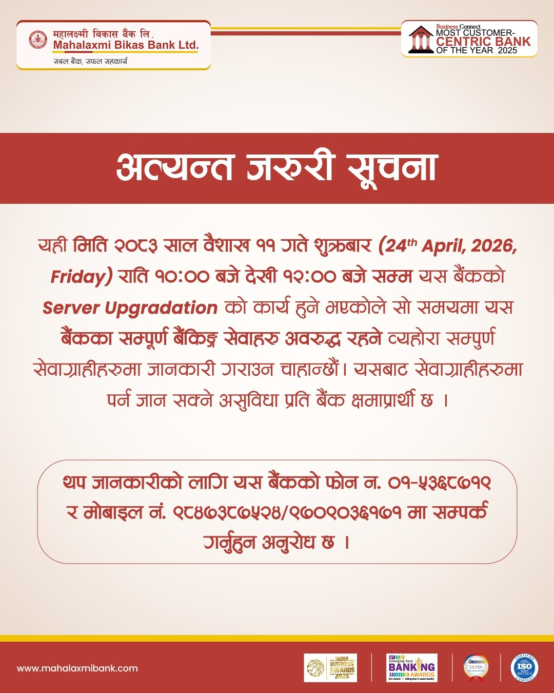 2024-11-29Copyright © 2026 Mahalaxmi Bikas Bank Limited. All Rights Reserved. Crafted By AMNIL Technologies Pvt.Ltd
